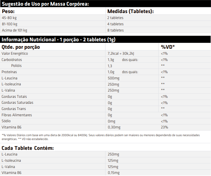 BCAA SCIENCE 500® – Tabletes Mastigáveis possui 500mg de aminoácidos de cadeia ramificada por tablete são formados pela L-Leucina, L-Valina e L-Isoleucina, esta combinação permite a diminuição do tempo de restabelecimento e recuperação muscular.