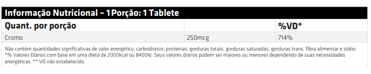Cada tablete fornece 250mcg de Cromo Picolinato Quelato.