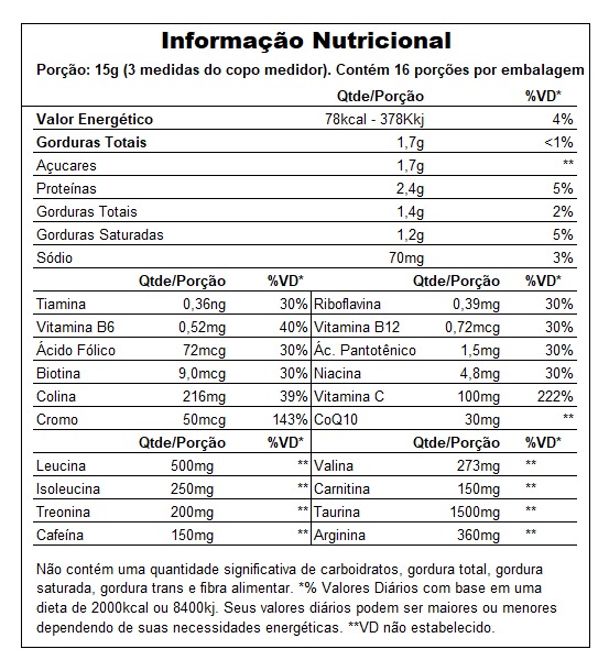 Sua fórmula completa ainda possui Complexo B, Tiamina, Riboflavina, Vitamina B e B12, Biotina, Niacina, Colina, Vitamina C, Cromo e Coenzima Q10.