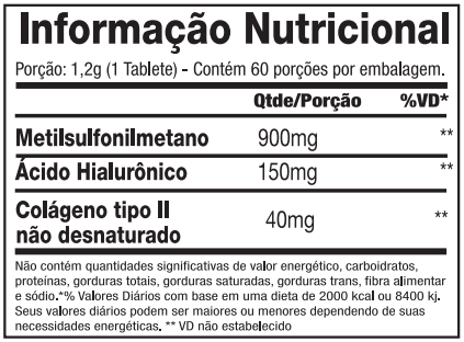 Ingredientes: Metilsulfonilmetano (MSM), Hialuronato de Sódio obtido pela fermentação de Streptococcus zoopidemicus, Colágeno de frango com colágeno tipo II não desnaturado, Estabilizante Celulose Microcristalina, Antiumectante Silica e Antiaglutinante Estearato de Magnésio.