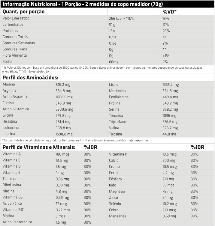 Possui 13g de Whey Protein Hidrolisado, a apresentação mais nobre desta proteína, e 51g de Carboidratos simples e complexos: Dextrose, Frutose e Maltodextrina. A combinação destes nutrientes torna o RECOVER® um produto completo para recuperação “pós-treino”, pois contém proteínas, carboidratos, vitaminas e minerais.