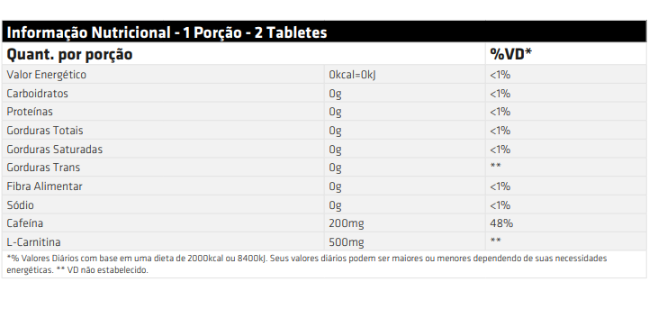 Fornece 500mg de L-Carnitina e 200mg de Cafeína por porção.