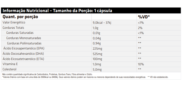 Ingredientes: Óleo de Peixe, Alfa Tocoferol (Vitamina E), Cápsula (Água Purificada, Gelitificante Gelatina, Emulsificante Glicerina). NÃO CONTÉM GLÚTEN.