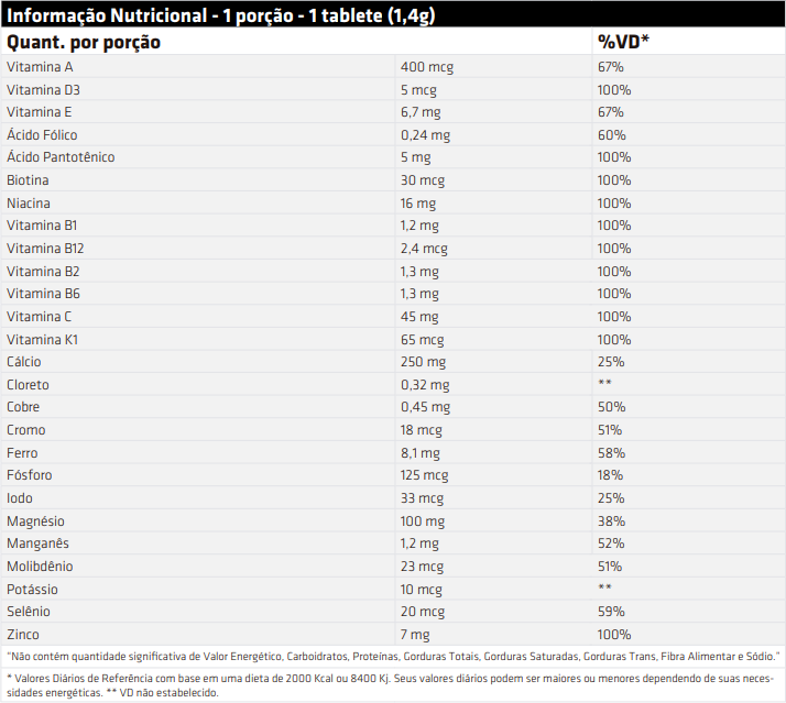 Ingredientes: Vitamina A Acetato, Colecalciferol, Vitamina E Acetato, Ácido Fólico, D-Pantotenato de Cálcio, Biotina, Niacinamida, Mononitrato de Tiamina, Cianocobalamina, Riboflavina, Piridoxina HCl, Ácido Ascórbico, Fitonadiona, Carbonato de Cálcio & Fosfato Dicálcico, Cloreto de Sódio, Sulfato de Cobre, Cloreto de Cromo, Fumarato Ferroso, Fosfato Dicálcico, Iodeto de Potássio, Sulfato de Magnésio, Sulfato de Manganês, Selenito de Sódio, Sulfato de Zinco. NÃO CONTÉM GLÚTEN.