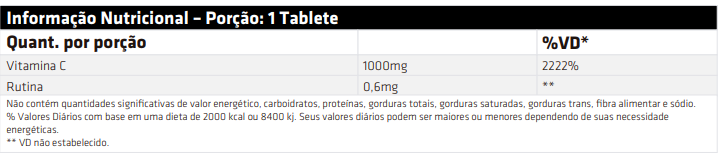 A Vitamina C 1000 mg com Bioflavonoides fornece em cada tablete 1000 mg de Ácido Ascórbico (Vitamina C) e 0,6 mg de Rutina. A Vitamina C é um antioxidante que auxilia na proteção dos danos causados pelos radicais livres, bem como no bom funcionamento do sistema imune. Esta vitamina auxilia também na formação de colágeno e no metabolismo energético. Recomendação de Uso: Consumir um tablete ao dia, de preferência às refeições, ou conforme a recomendação de um nutricionista e/ou médico nutrólogo. Embalagem: 60 e 100 tabletes.